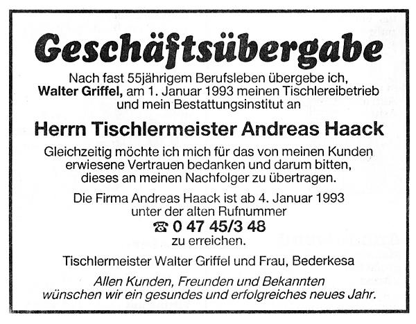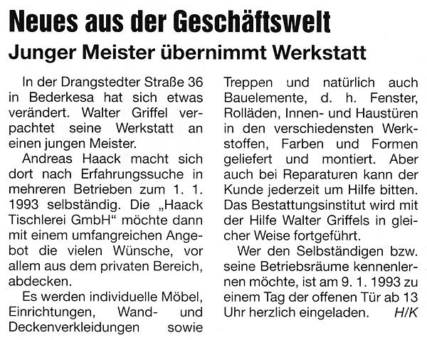 Durch die Geschäftsübernahme der Tischlerei Walter Griffel gründet sich offiziell die Haack Tischlerei GmbH. Unsere Schwerpunkte lagen zu dem Zeitpunkt vor allem im handwerklichen Treppenbau und dem privaten Möbelbau. Erste Aufträge im Ladenbau entstehen für die Firma Bening und markieren einen Trend in unserem Tätigkeitsfeld.